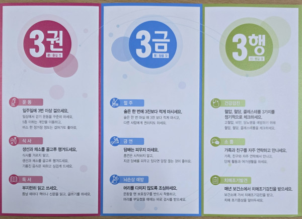 치매예방수칙 3.3.3 페이지 정보 작성자최고관리자 댓글 0건 조회 42회 작성일 25-09-12 19:05 본문 3권(즐길 것), 3금(참을 것). 3행(챙길 것) 목록 답변 이전글장기요양급여종류와 월한도액 25.09.14 다음글국가건강검진 25.09.12 댓글목록 댓글목록 등록된 댓글이 없습니다.