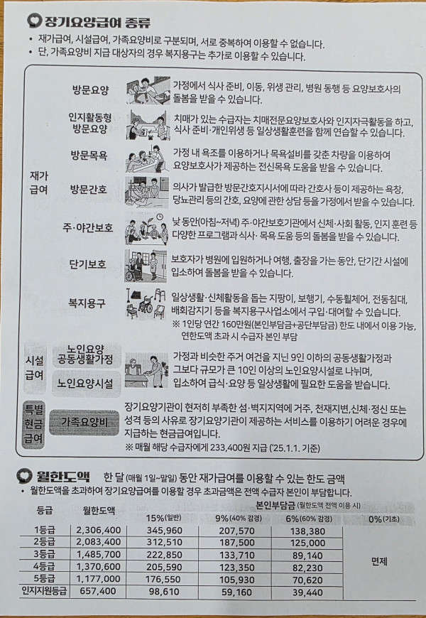 장기요양급여종류와 월한도액 페이지 정보 작성자최고관리자 댓글 0건 조회 79회 작성일 25-09-14 21:19 본문 장기요양급여종류와 2025년 월한도액 목록 답변 이전글건강습관! 올리GO 대사증후군! 잡GO 25.09.14 다음글치매예방수칙 3.3.3 25.09.12 댓글목록 댓글목록 등록된 댓글이 없습니다.